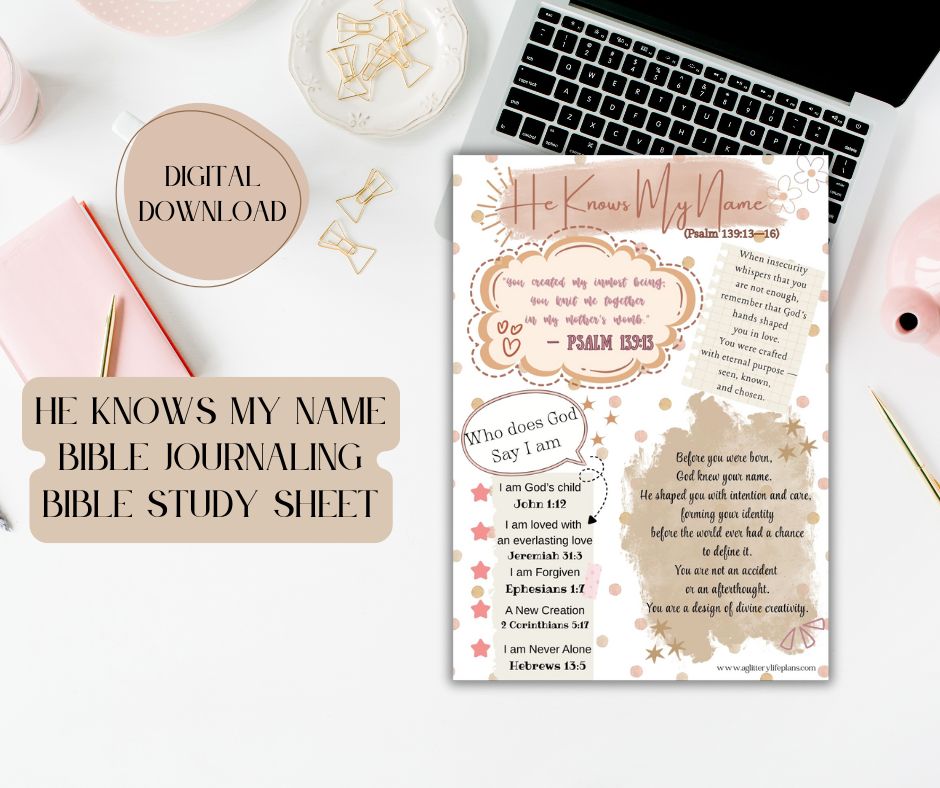 Dive deeper into God’s personal love and faithfulness with this beautiful He Knows My Name printable a 5×7 devotional sheet designed to encourage your heart every time you see it. This digital download reminds you of the truth that the Creator of the universe knows YOU intimately, personally, and with unending love.